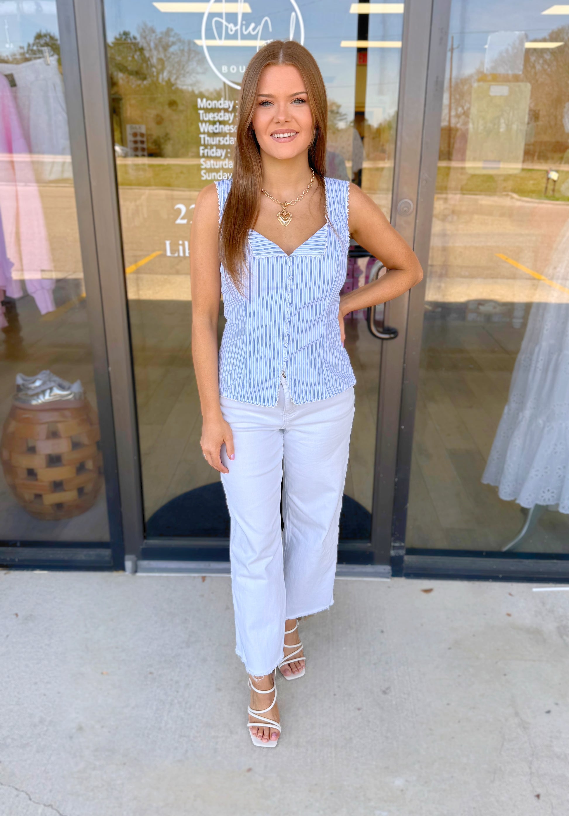 Pin striped sleeveless lace trim non-functional button down top with side zipper closure. Lining.
