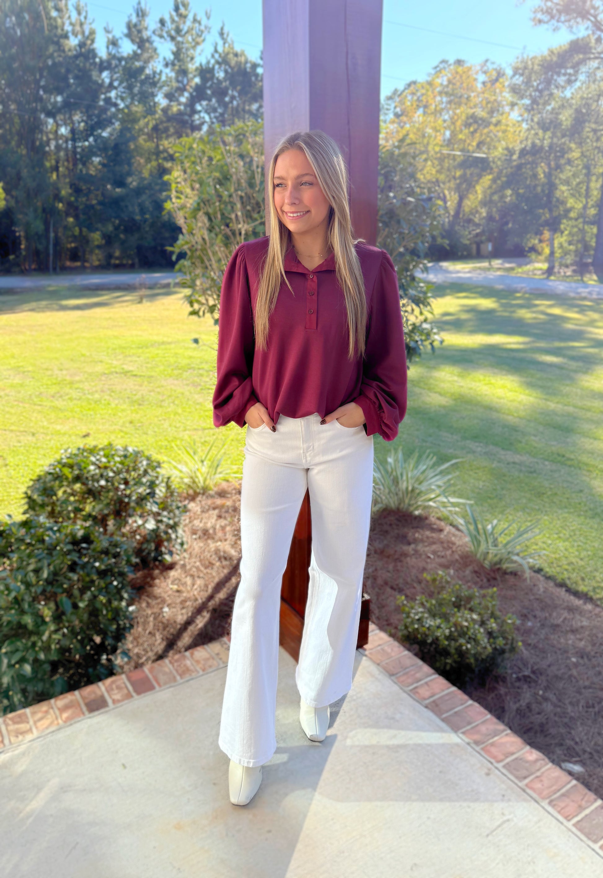 Long balloon sleeves button up mock neck solid top with solid fabric mix match.
