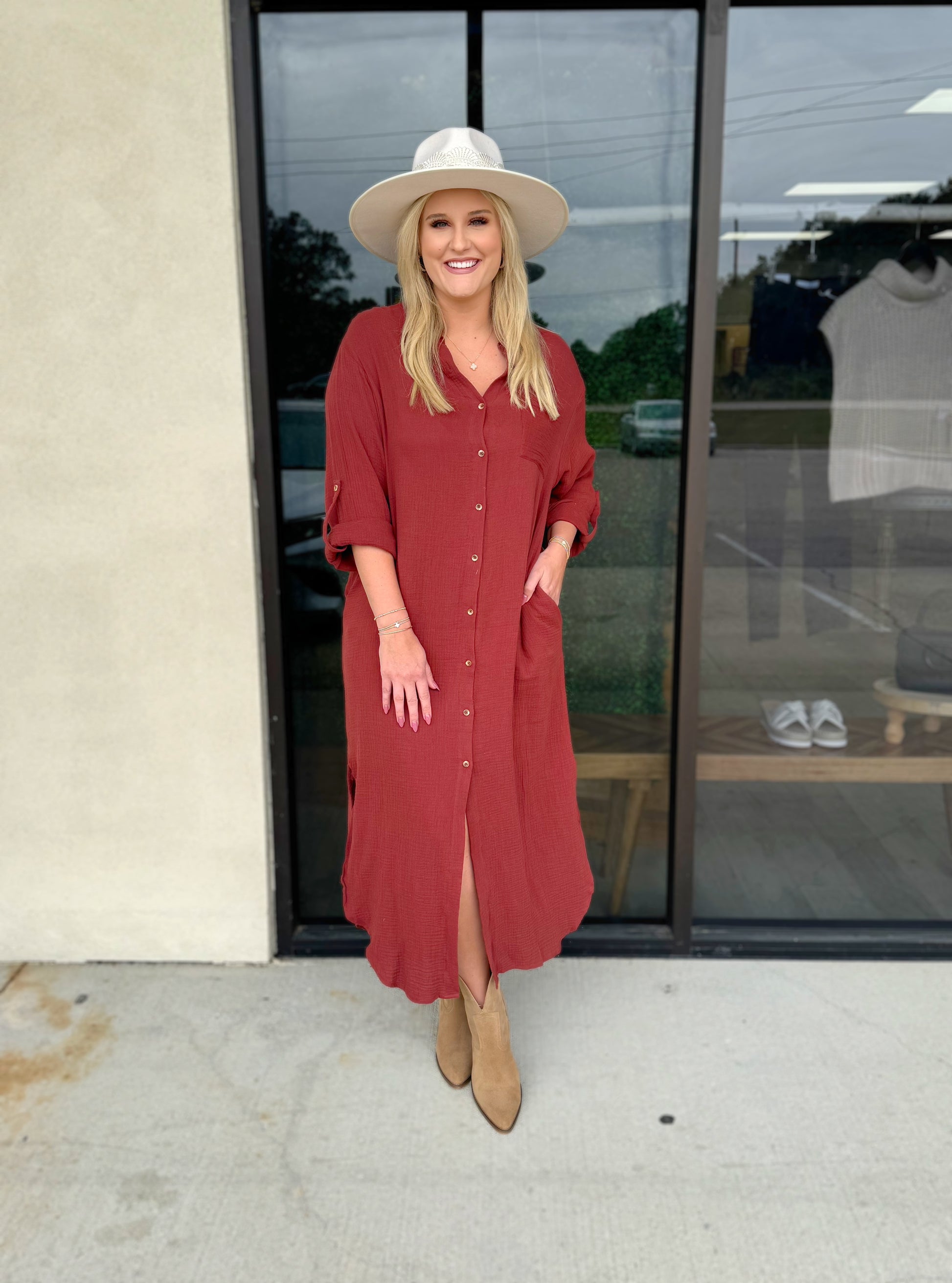 Woven maxi dress featuring a textured cotton fabric, v-neckline with a collar, roll tab long sleeves with cuffs, button up front, side seam pockets, side slits, front breast pockets and a relaxed fit