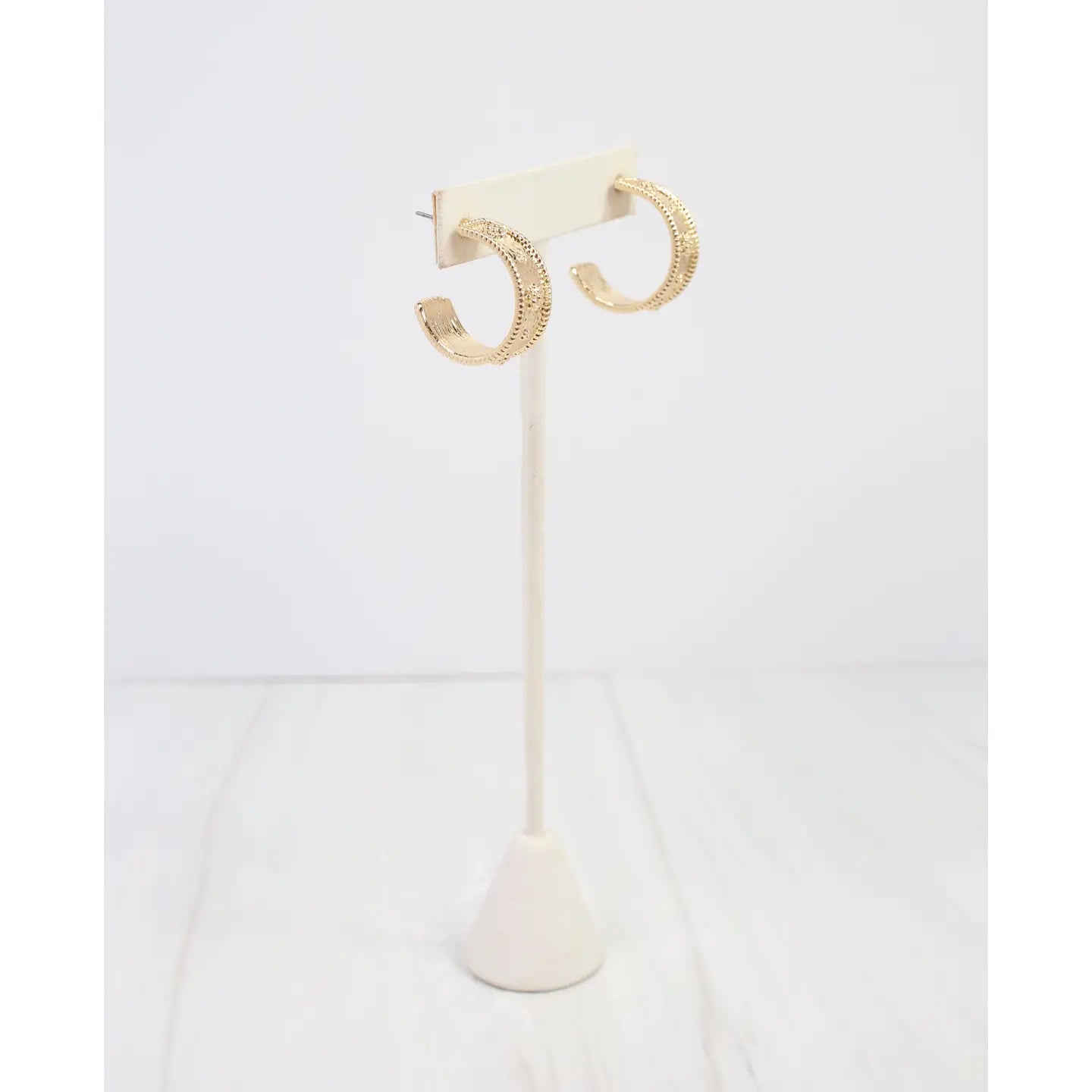 The Canton Textured Hoop Earrings in gold offer a refined blend of classic shape and intricate texture, creating a sophisticated accessory that elevates any ensemble with subtle elegance.