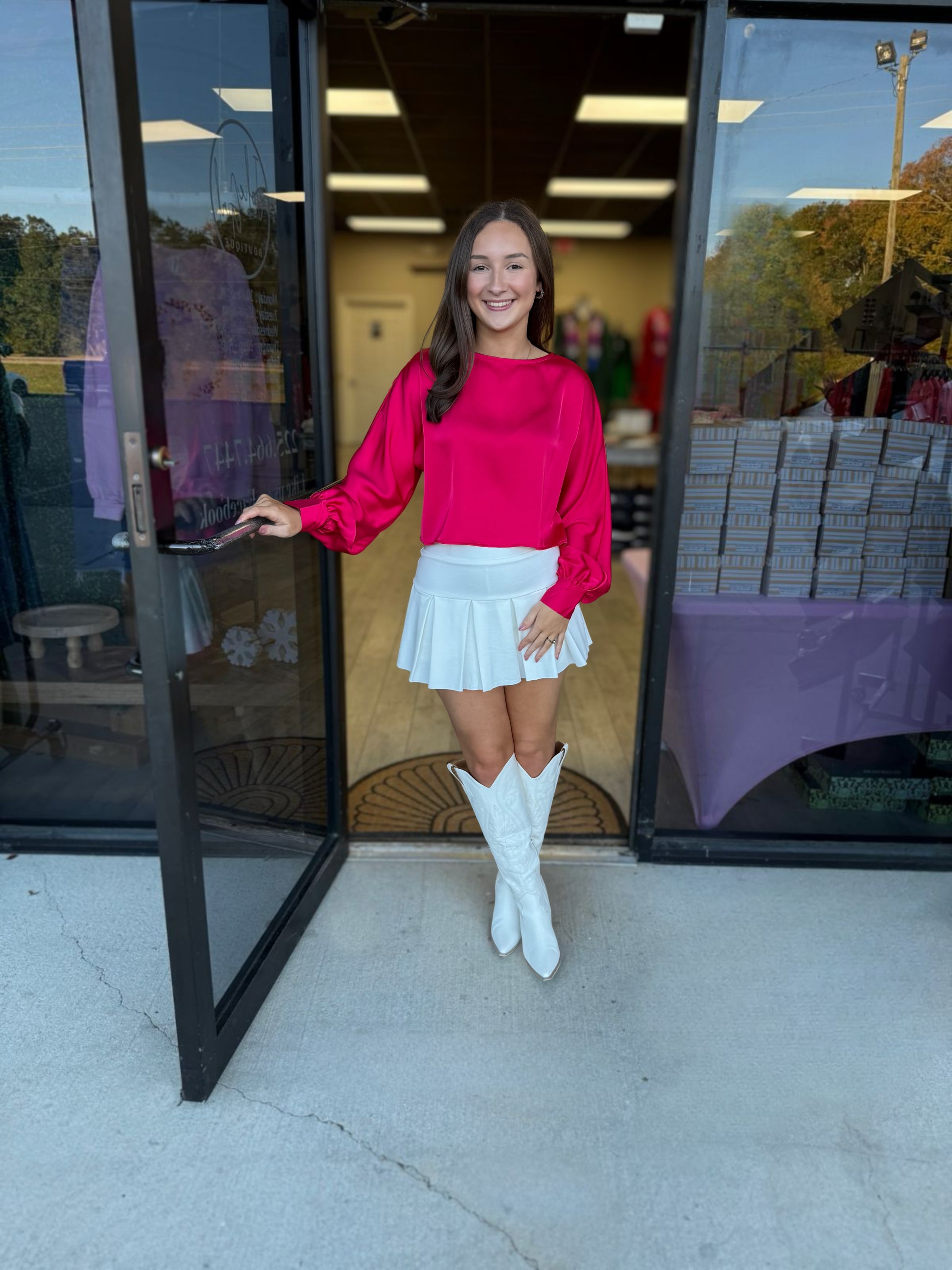 Long sleeve blouse in satin fabric. This style features a round neckline, relaxed long sleeves with buttoned cuffs, and a keyhole with button closure at back.