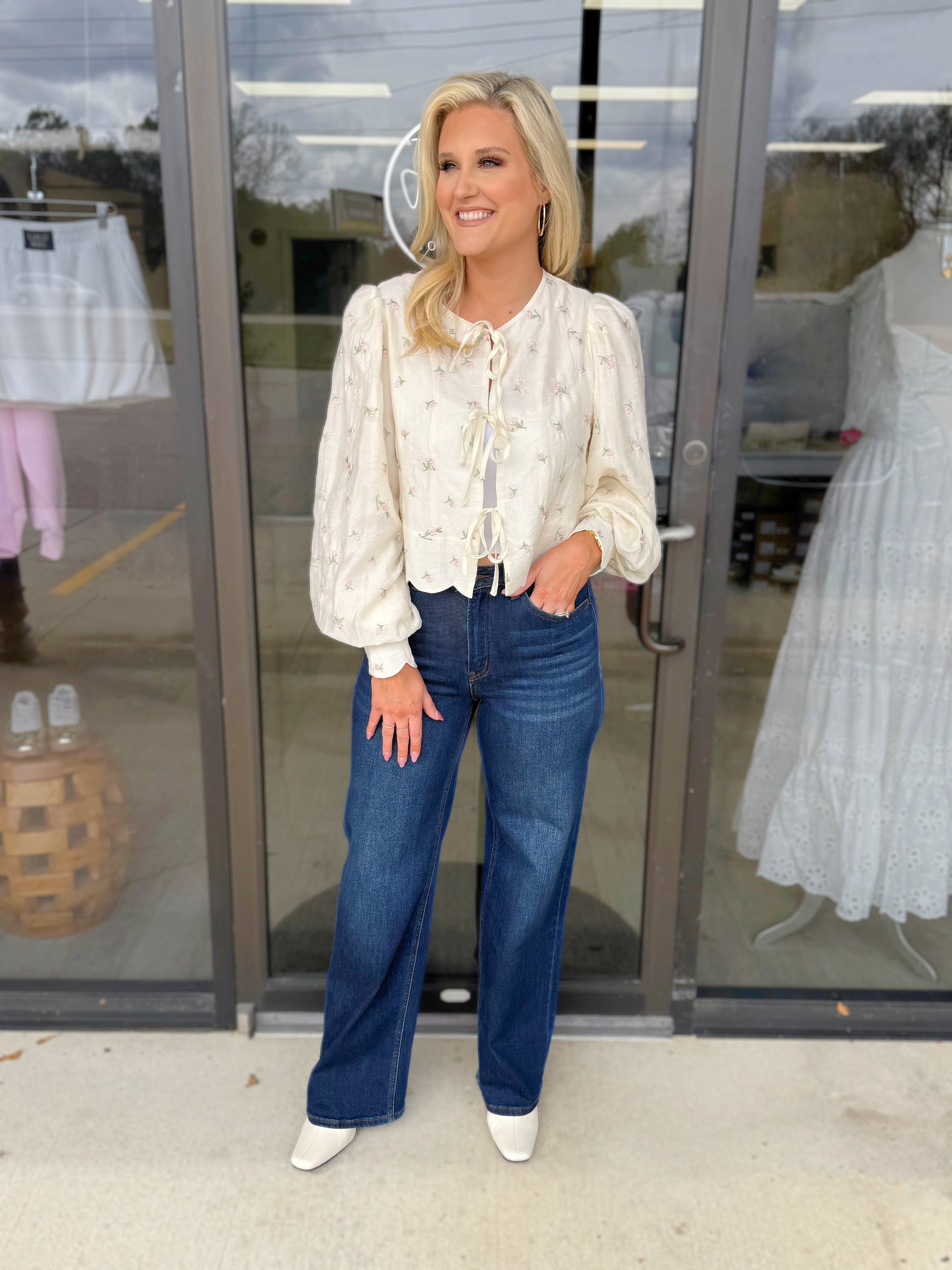 Ditzy floral embroidered blouse. Designed with a round neckline and a scalloped hem finish. Features adjustable self-tie front closures for fit adjustment. Long sleeves are finished with gathered cuffs for added volume. Lining.