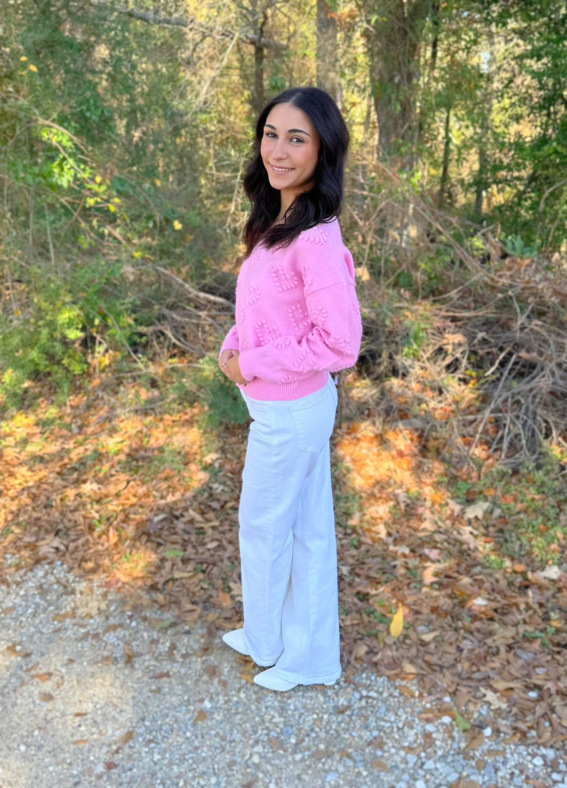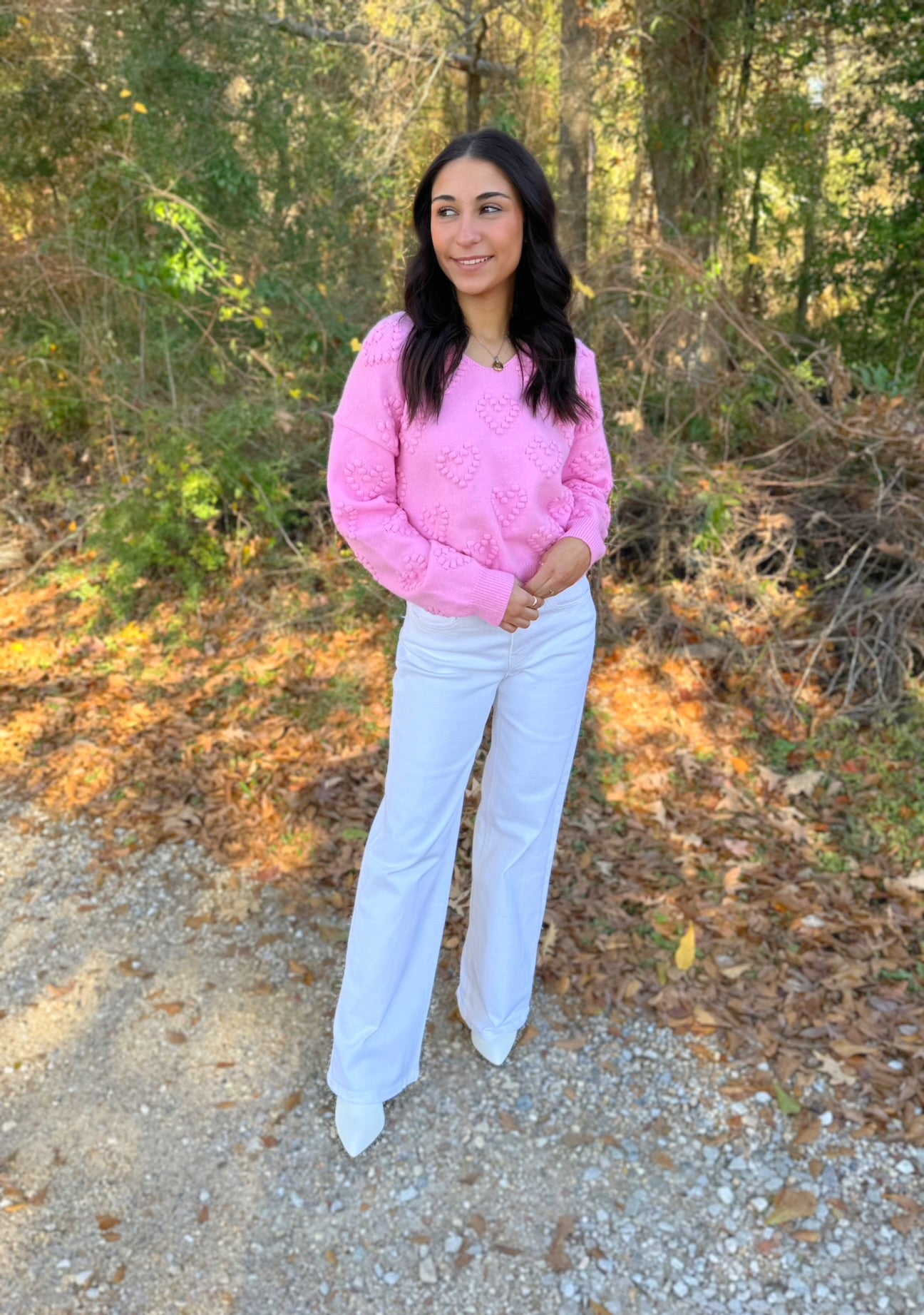Fall in love with cozy style in this charing sweater, designed with playful textured heart detail all over. Crafted from a soft knit fabric, it features a relaxed fit with a flattering v-neckline and ribbed trim for a classic finish. Perfect for a adding a sweet and feminine touch to your everday look. This sweater pairs effortlessly with jeans, skirts or layered over a dress. A must-have piece to keep you warm and stylish this valentine's season and beyond.