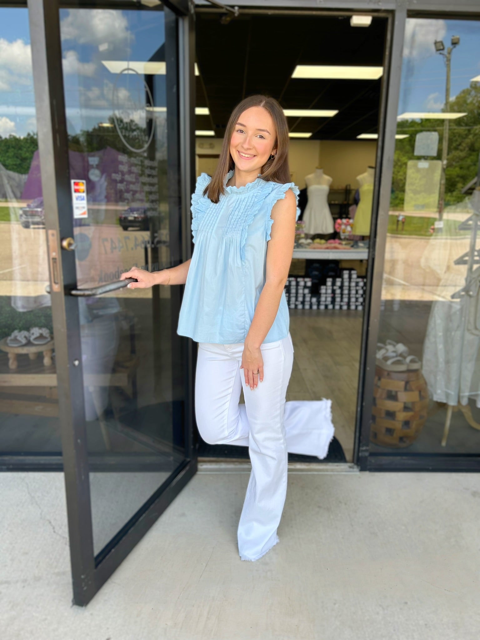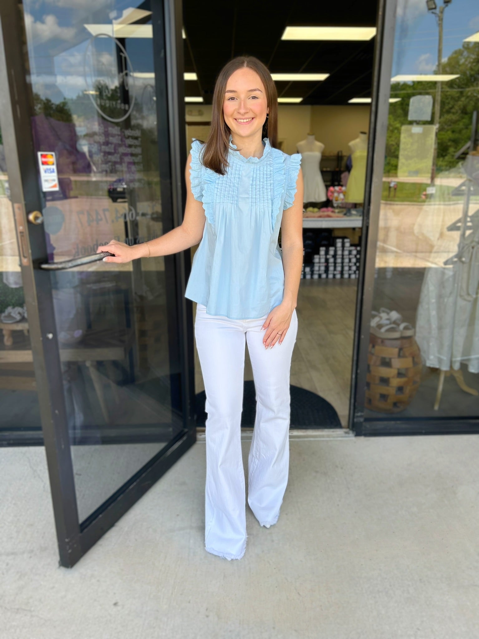 Add some playful elegance with our Laced in Blue Blouse. This sleeveless beauty features charming ruffle sleeves and delicate lace detailing, perfect for a sophisticated yet fun look. Don't just wear blue, be laced in it!