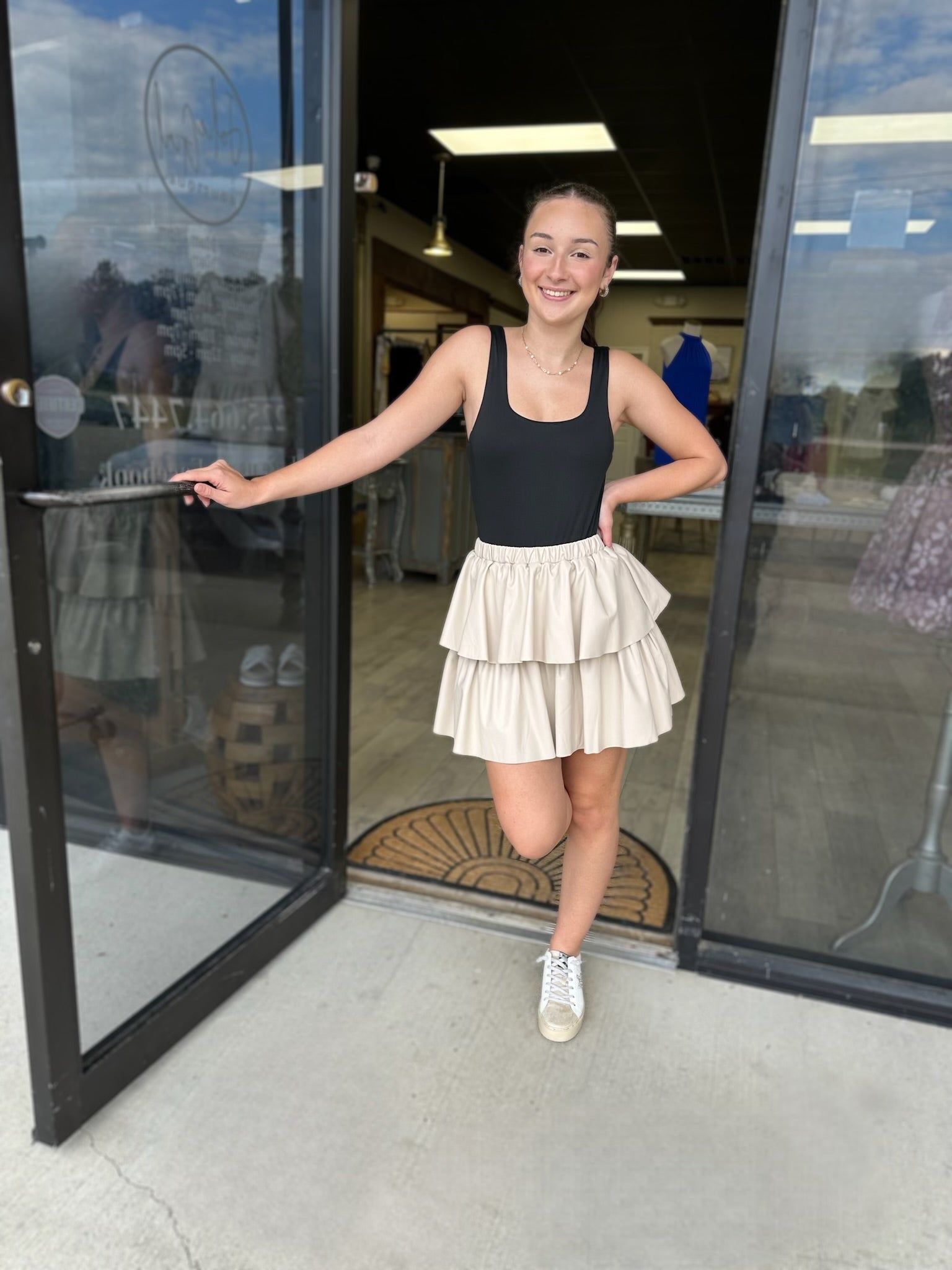 - Faux leather - Ruffled detail - Tiered - Shorts inside