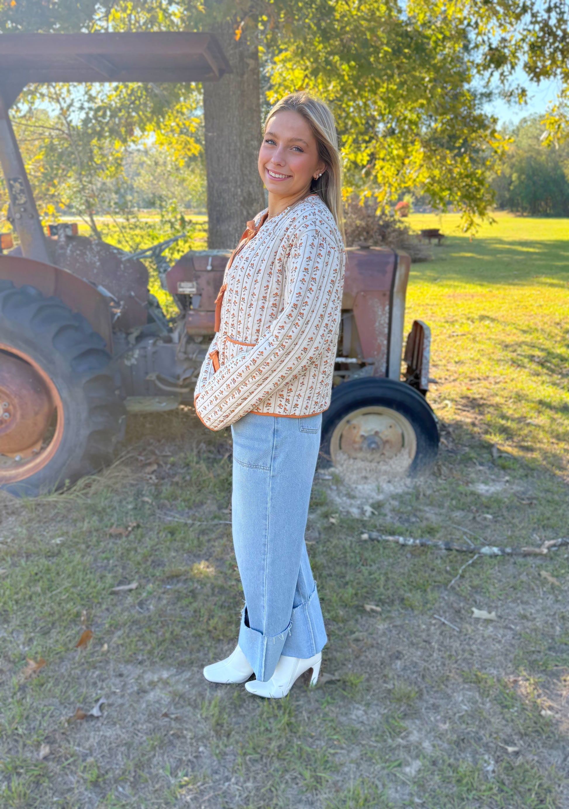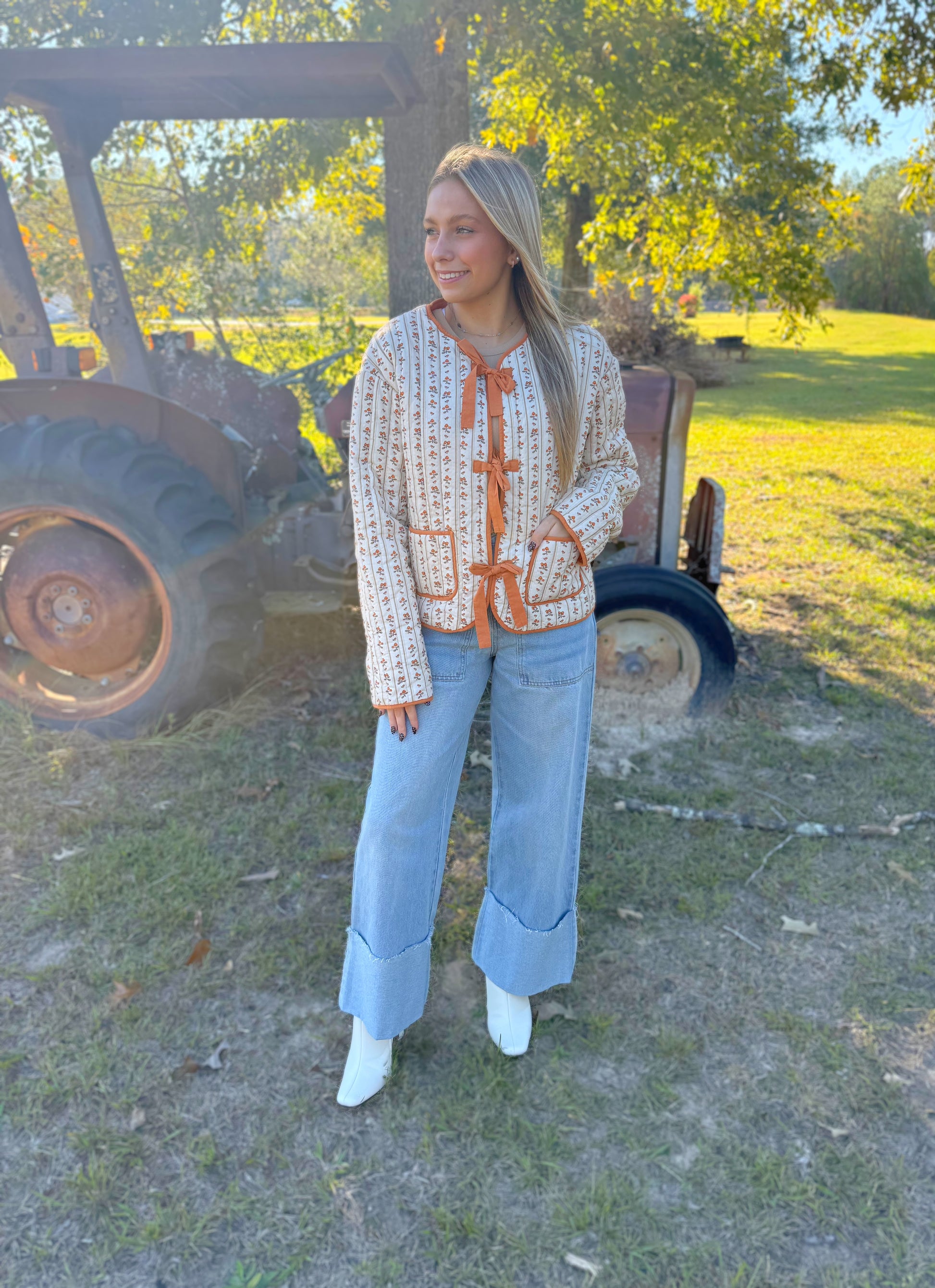 Stay cozy and cute in this charming puffer jacket featuring a delightful persimmon hue paired with an adorable floral pattern. Playful bow tie accents add a touch of whimsy to this lightweight layer, making it perfect for chilly days when you want to look effortlessly stylish. Whether you're running errands or meeting friends, this jacket keeps you warm while letting your personality shine through. A must-have piece that brings joy to your everyday wardrobe!