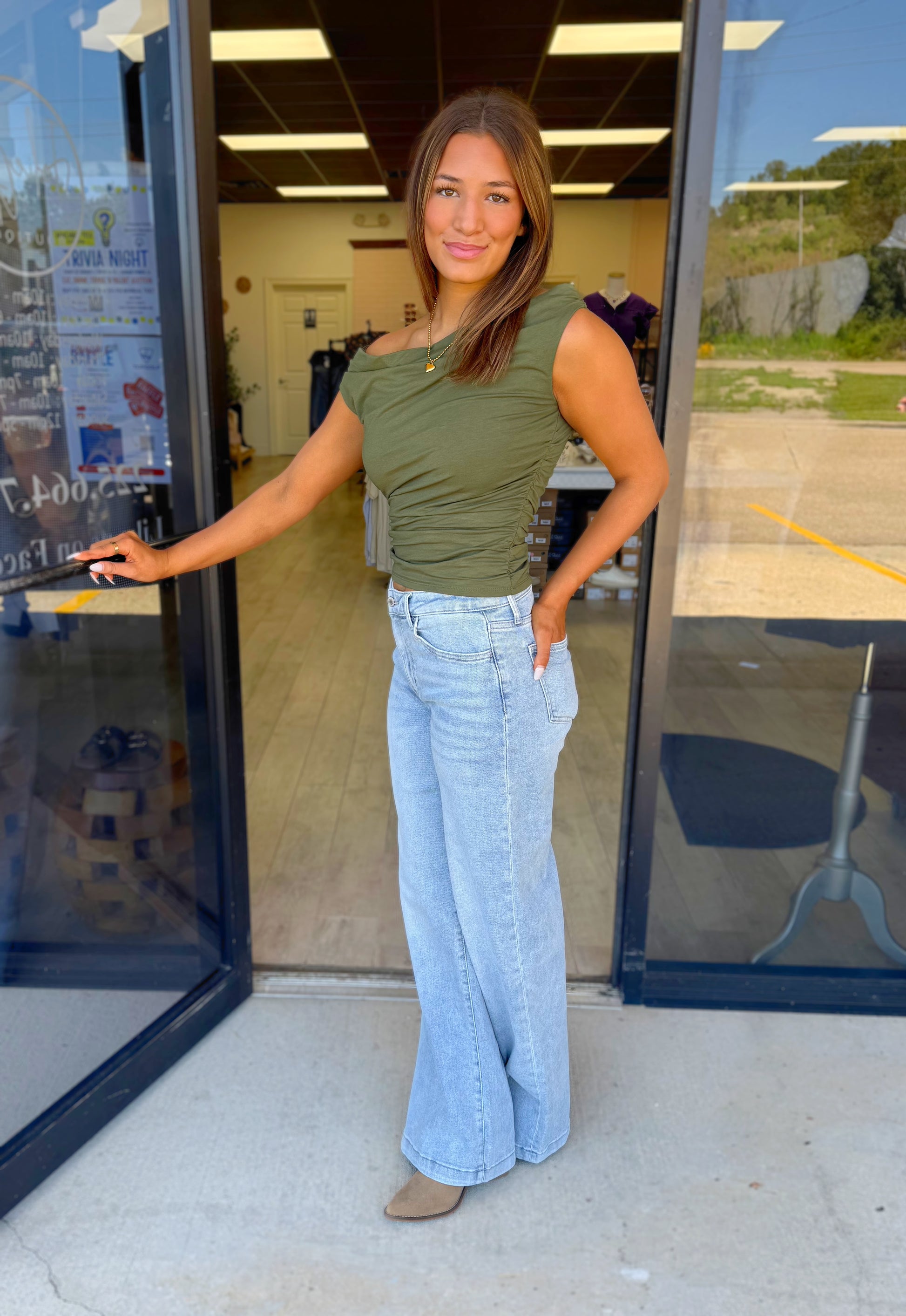 Elevate your style with the Rightly Ruched Top, featuring a flirty off-the-shoulder design that highlights your neckline. The playful ruching adds a charming texture, making it perfect for sunny days or fun nights out. Lightweight and breezy, this top brings effortless chic to every look.