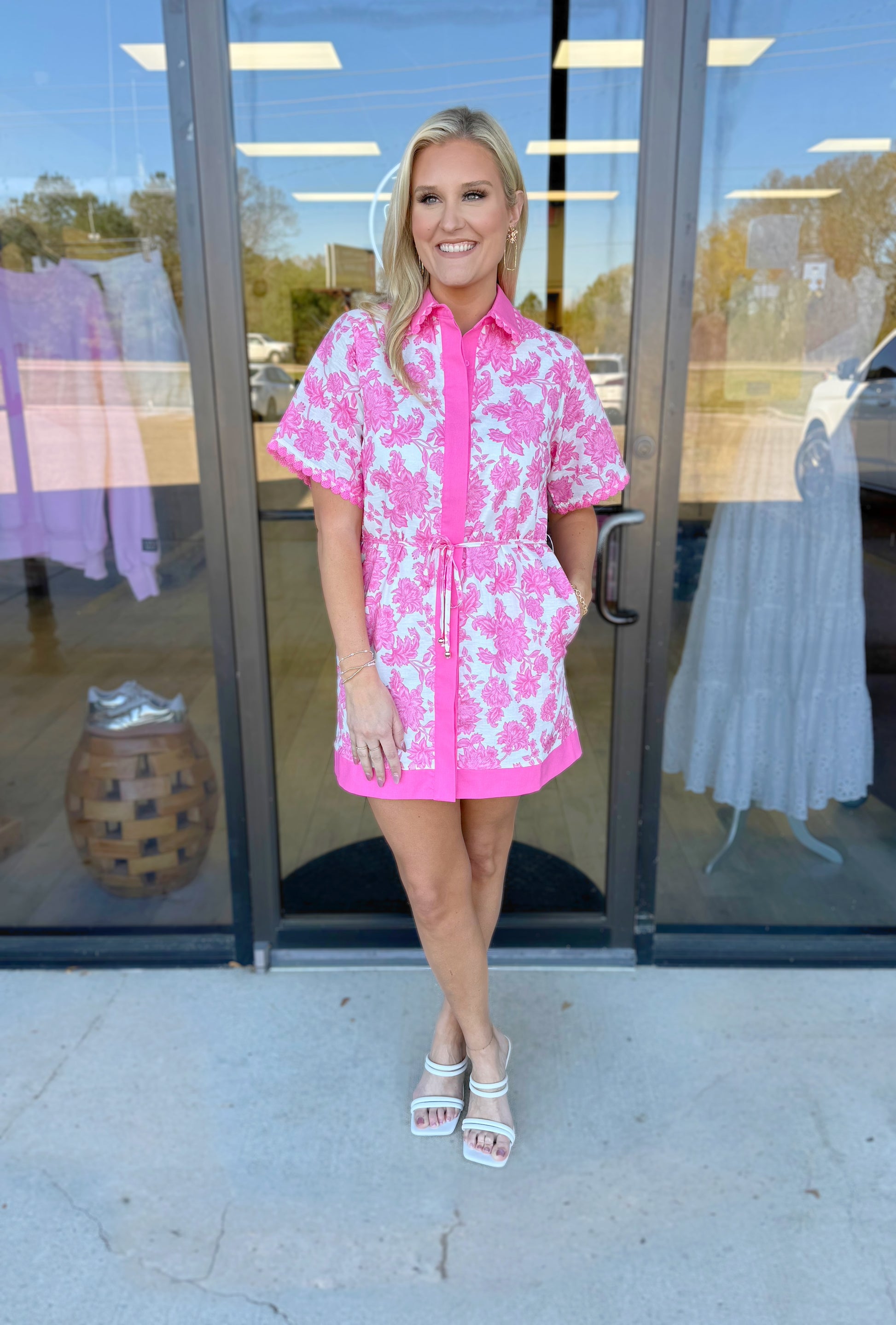 Crochet trim shirt mini dress in an exclusive botanical garden floral print on cotton linen blend fabric. This tropical preppy mini shirt dress features a spread collar, short sleeve with scallop crochet trim, relaxed fit, contrast color fabric at placket/collar/hem, placket button down closure at front, removable waist tie belt, side pockets and lining. The perfect dress for a casual weekend, beach to bar cover-up, vacation or a day event.