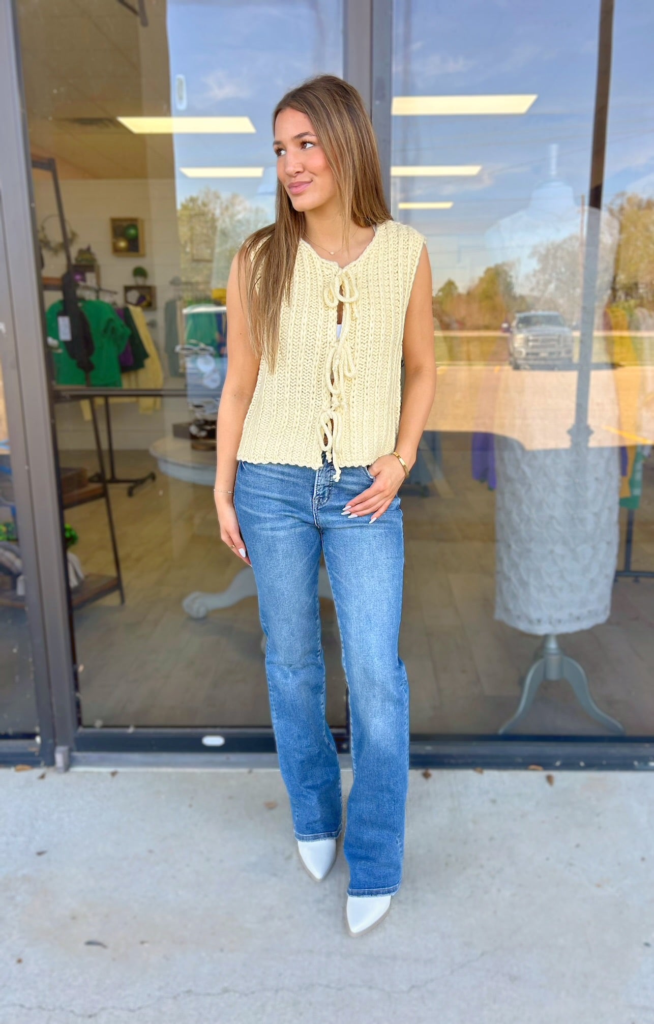 Layer up with effortless charm in this sunny sweater vest! The chunky knit and front tie detail add instant personality to any outfit, while the round neckline keeps things classic and versatile. Perfect for throwing over your favorite tee or dress for a cozy, put-together look.